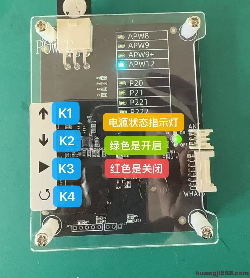 3.当按“K3”按键后,电源状态指示灯变成绿色后,此时电源应该有输出,如果没有输出,请检查电源型号和电源是否正常,以及电源的厂家是否在我们的支持范围内。